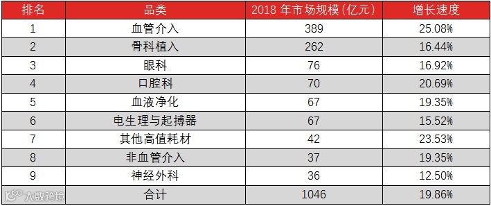 2018年,整个高值耗材市场规模达到1046亿元,行业增速约20%。心血管作为高值耗材领域市场最大的一个细分市场,占高值耗材市场整体37%,增速约25%,高于医疗器械行业整体水平。