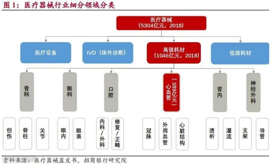 医疗器械行业分为医疗设备、高值耗材、IVD(体外诊断)、低值耗材等领域,2018年国内整体市场规模约5300亿元。其中,高值耗材市场占比为20%,仅次于医疗设备(57%),是医疗器械第二大细分市场。