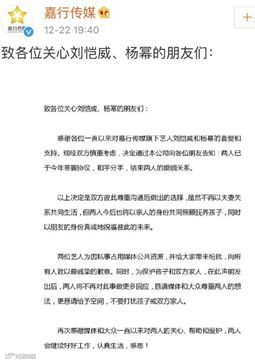 就在上周六,杨幂所在的经纪公司对外发布声明,两人在今年签署协议,和平分手,结束婚姻关系。公告一出,网友们众声哗然,昔日各种秀恩爱的场景仿佛显得啪啪打脸了,毕竟从两人2012年确立恋爱关系之后到现在已经接近第七个年头,七年之痒几个字显得更加刺眼。