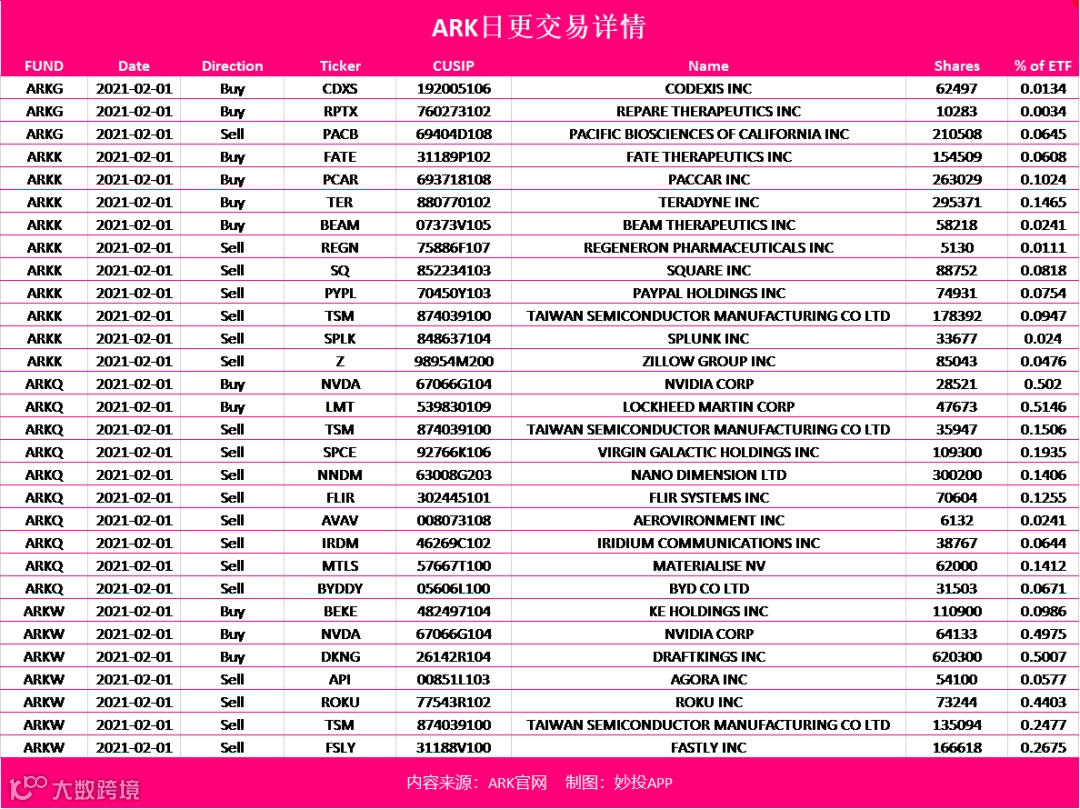 ARK的最新投资动态已更新。接下来我们分别看看每项ETF的具体交易情况。