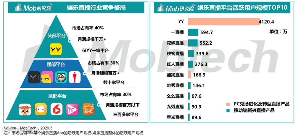 根据MobTech提供的报告显示,截止2020年第一季度末,YY的市占率约在40%左右,是唯一月活超过千万级的娱乐直播平台,其体量超过了第二梯队数十家平台之总和。