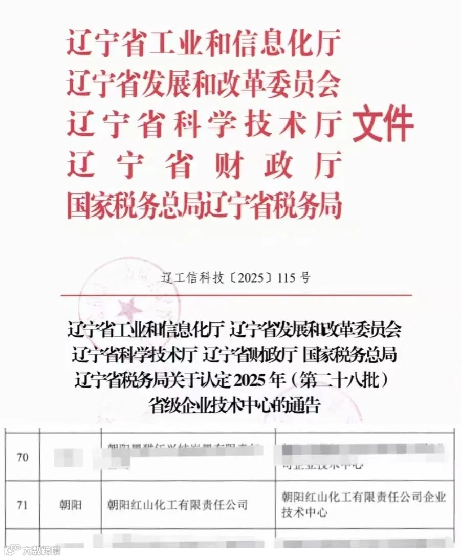 近日,辽宁省工业和信息化厅、辽宁省发展和改革委员会、辽宁省科学技术厅、辽宁省财政厅、国家税务总局辽宁省税务局联合发布了《关于认定2025年(第二十八批)省级企业技术中心的通告》,江南化工朝阳红山凭借完善研发体系顺利通过审核,被正式认定为省级企业技术中心。