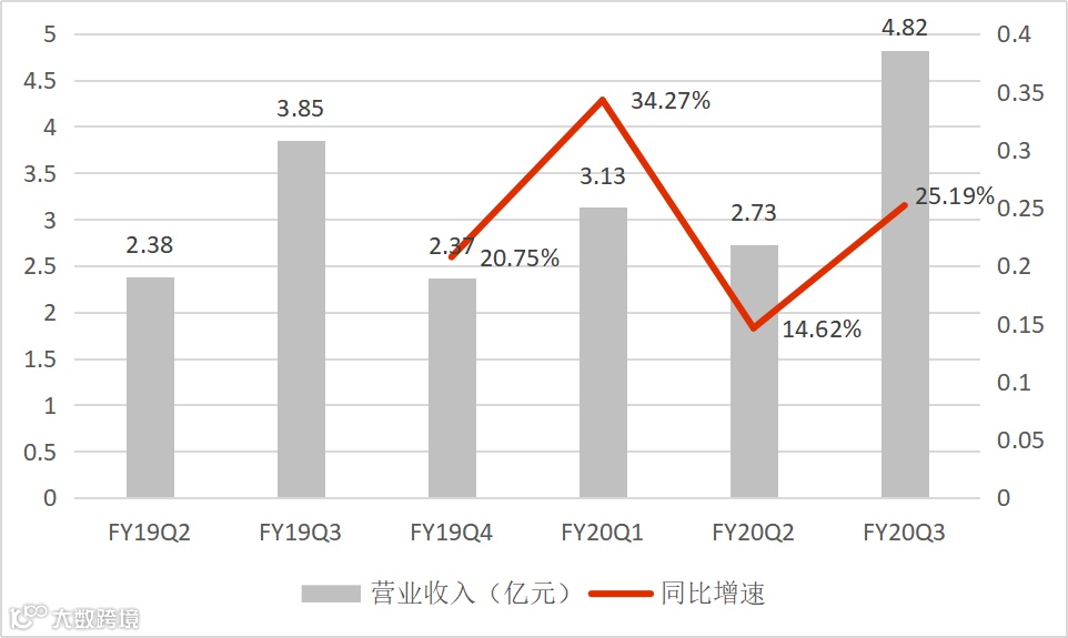 2020财年第三季度,如涵控股实现营业收入4.821亿元,同比增速为25.19%,高于环比和同比的数据,主要得益于“双11”销量的贡献。