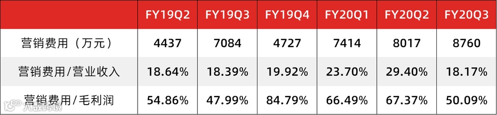在头部KOL难以复制的情况下,如涵控股花费大量的营销费用大规模孵化腰部和新晋KOL力量。FY19Q2-FY20Q3,如涵控股的营销费用占毛利润的50%以上,高企不下。