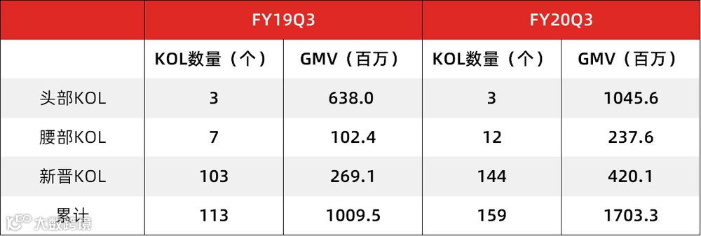 截至2020财年第三季度,如涵控股共签约了159名KOL。其中,头部KOL共3名(张大奕、大金和莉贝琳),在第三季度实现GMV人民币10.46亿元,同比增长63.89%,占总GMV的61.43%。近几年来,如涵一直保持3位头部KOL,说明成功孵化头部KOL并不容易。