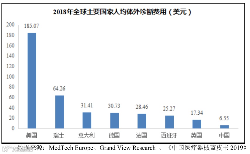 尽管我国体外诊断行业保持了较快的增长速度,但与发达国家相比,我国的体外诊断市场远没有饱和。从人均体外诊断费用来看,2018年中国人均体外诊断费用仅为6.55美元,远低于美国、欧洲等发达国家的人均费用。