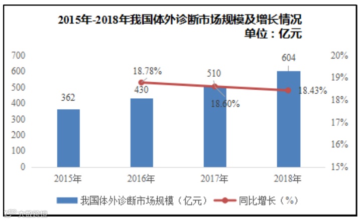根据医械研究院2019年发布的《中国医疗器械蓝皮书 2019》,2015年我国体外诊断行业市场规模为362亿元,2018年增至604亿元,年均复合增长率为18.61%。