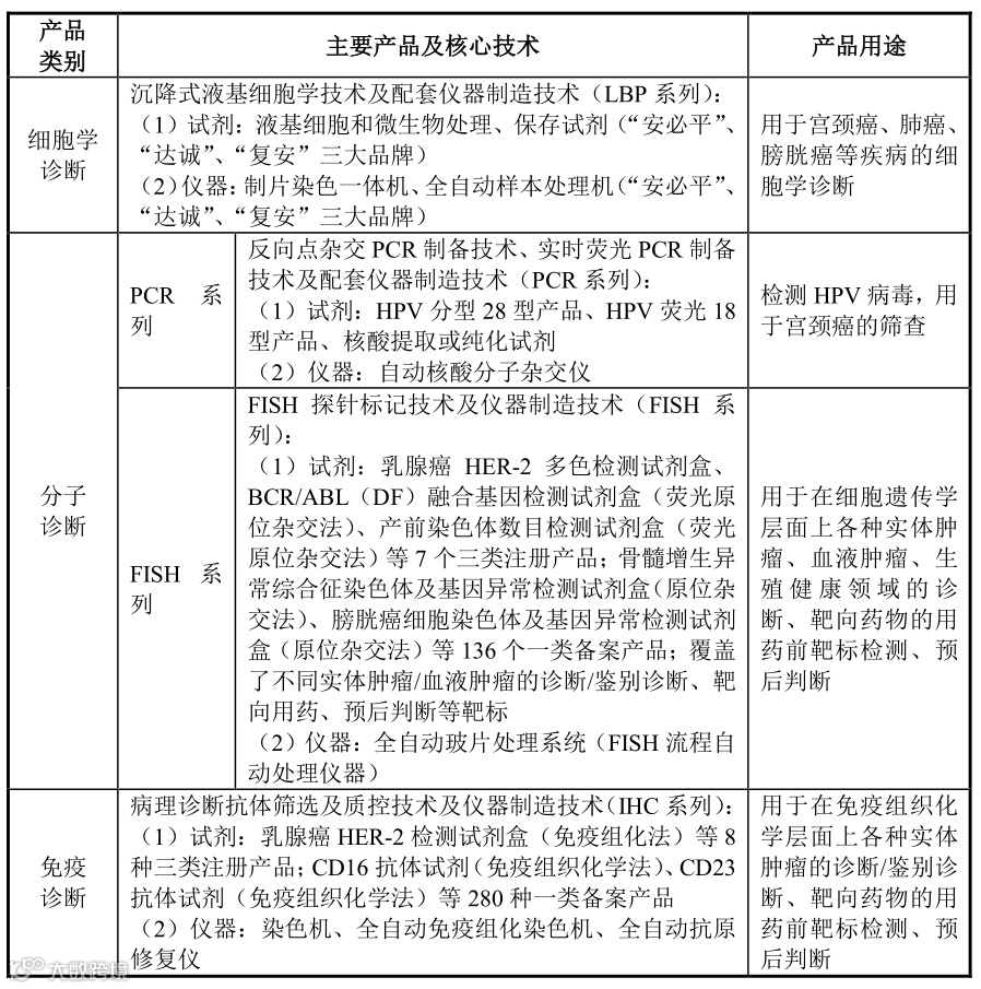 公司的主要产品为病理诊断试剂和仪器,涵盖细胞学诊断、分子诊断和免疫诊断三大技术平台,主要应用于肿瘤的病理诊断,主要销售对象为各级医院的病理科。
