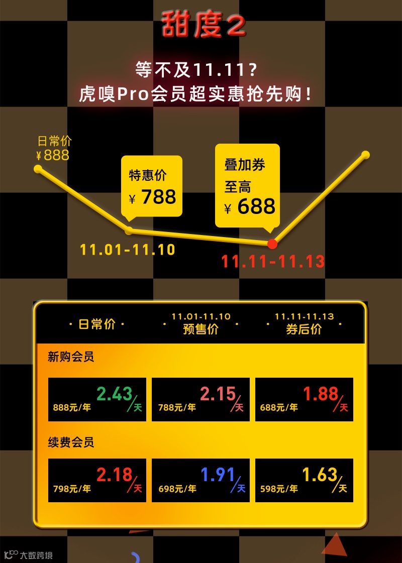 当然,如果不想等到11.11当天再下单,虎嗅Pro为你开辟了特惠通道,今天起至11月10号,虎嗅Pro会员下单直接减100元!
