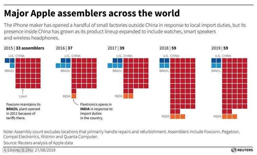 尽管苹果极力想把供应链分散在不同地点,但消息指出,印度的供应链环境一直无法满足苹果的供应链速度。所以路透社指出,在贸易战的阴影下,苹果的供应链却反而愈来愈依赖中国(上图)。
