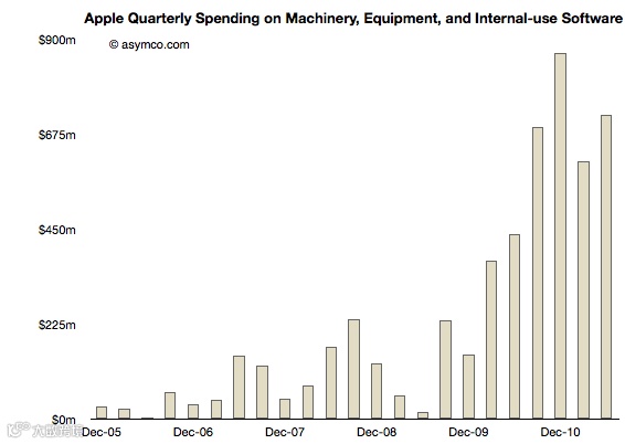 苹果常用的手段,是回到“大规模采购”的传统模式。根据独立分析师 Horace Dediu 的统计,苹果在 2010 年就为供应链投资了数十亿美元(上图),而彭博更指出,苹果 2013 年在供应链的机器与激光设备上投资了 105 亿美元之多。