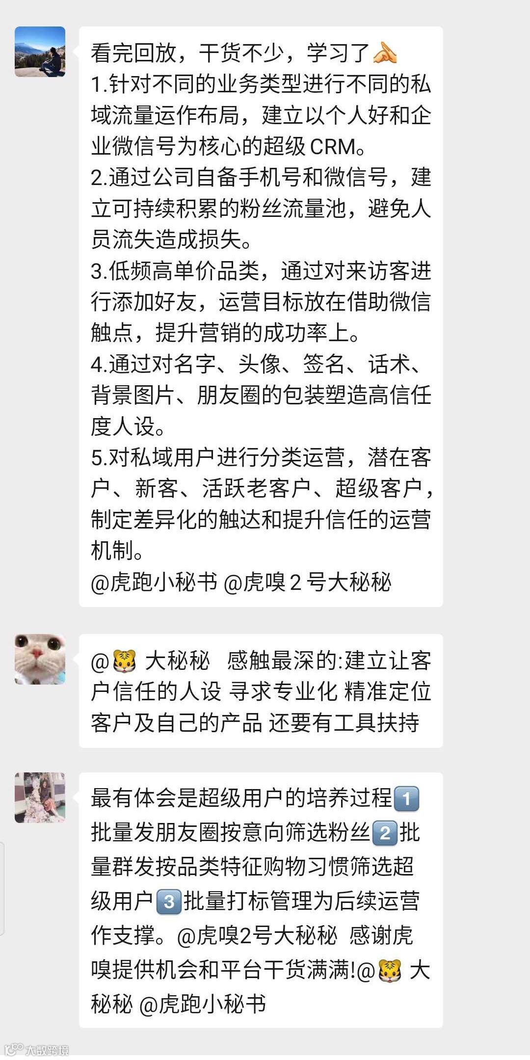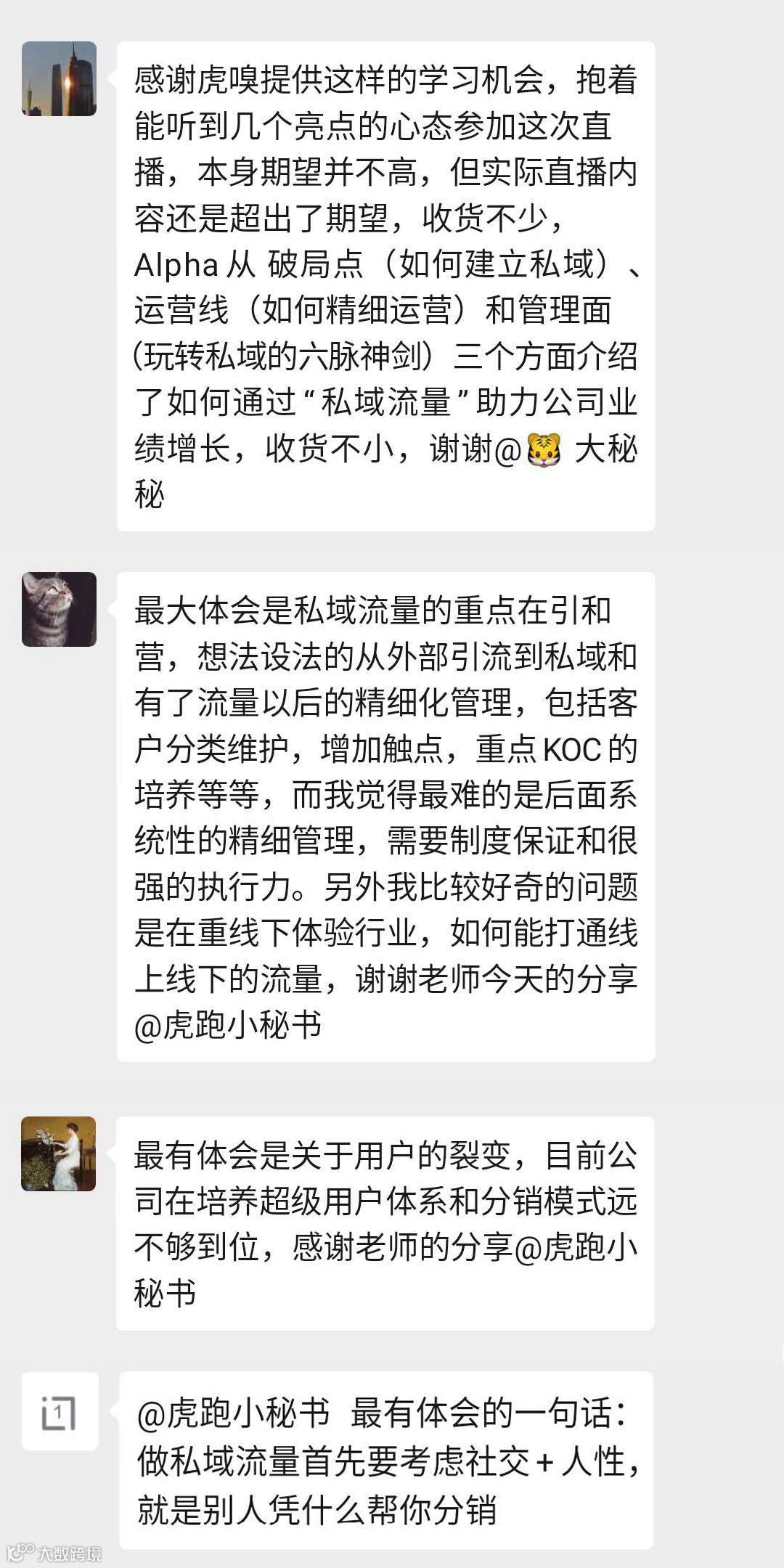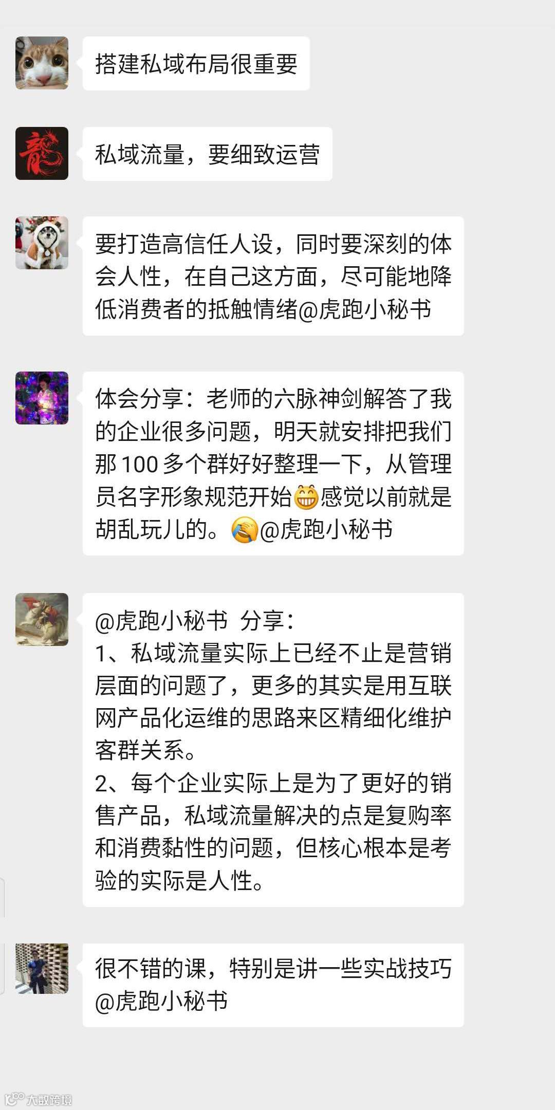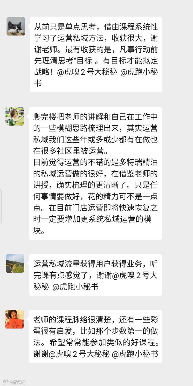本期视频直播课兼具理论与实操性,颇受好评,很多学员表示意犹未尽。也正因如此,我们将于3月15日(本周日)上线虎跑·大咖说第二期,推出”私域流量“进阶课 ,聚焦门店流量拉新、运营到付费转化的实操痛点,感兴趣的朋友也可以在本末占位报名~