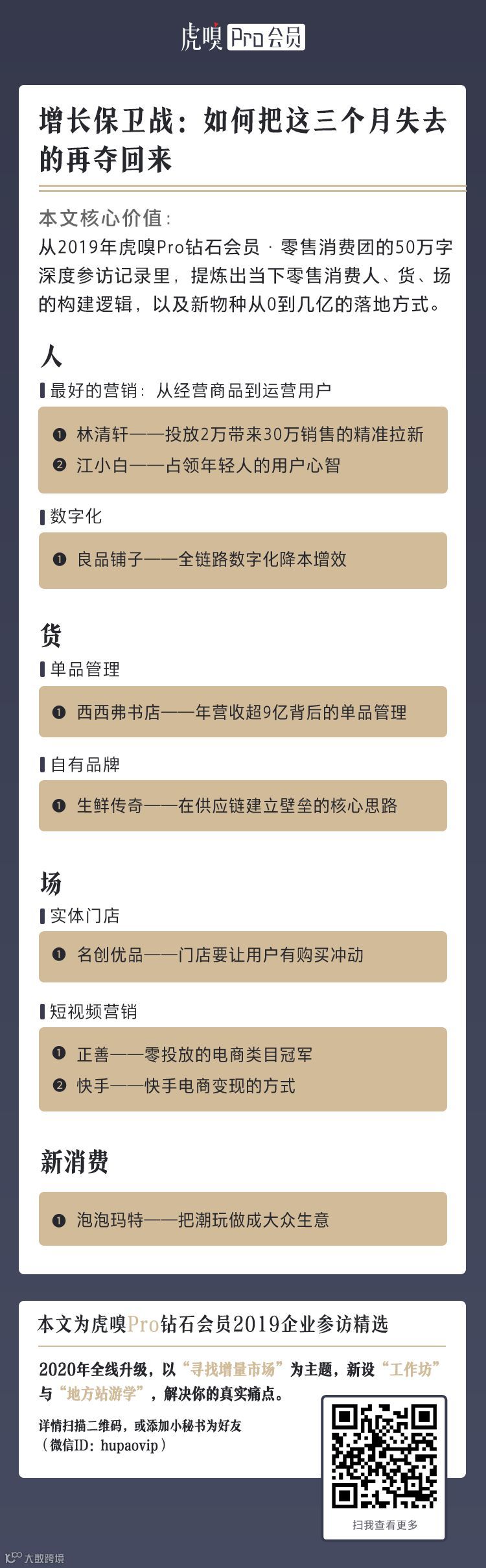 #本文是虎嗅Pro钻石会员专享文章删减版。当然也是一个延迟版,早先入会的会员已提前一年半载掌握了这些实战动向。2020年的零售消费班车,你又怎会想再晚搭一年?