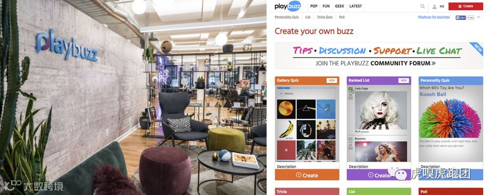 Playbuzz是一个娱乐休闲内容在线制作平台,可以用于制作小型视频、个性测试、民意测验、冷知识、排行榜、倒计时等。平台上有各种各样的模板来制作这些大众喜爱,传播度高的内容。众多市场营销人士、博主和品牌在Playbuzz上通过模板创建数字内容,并分享到社交网络上,Playbuzz因此迅速发展。他们利用Playbuzz制作内容,与客户互动,可以有效降低获客成本——获得更多的访问流量,影响力更大,用户停留时间更长,品牌知名度与收益更大。