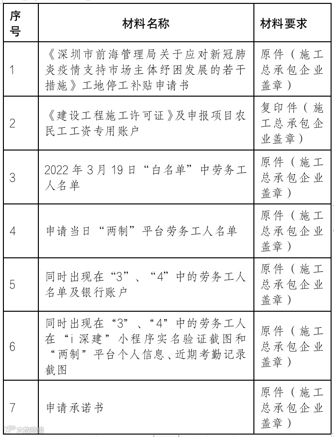 2.施工总承包企业在获批相应补贴后,于10个工作日内将补贴转入符合资格的劳务工人账户的银行流水记录,打印、盖章(银行章加申报企业章)、扫描后,发送至该项目指定邮箱liangcw@qh.sz.gov.cn,邮件命名为:“工地停工补贴+企业名称+项目名称+银行流水”,纸质版交至前海国际人才港防疫惠企专窗(地址:深圳市南山区梦海大道5073号五层前海国际人才港防疫助企窗口,联系电话:0755-86558302)。