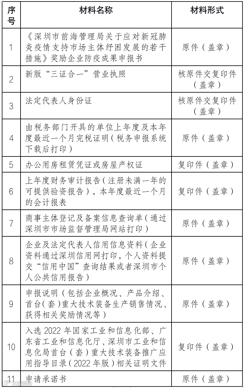 注:1.所有材料签字盖章交至前海国际人才港防疫惠企专窗(地址:深圳市南山区梦海大道5073号五层前海国际人才港防疫助企窗口,联系电话:0755-86558302),须将申报书连同上述附件打印完整材料(一式三份,A4规格,清单可A3规格,正反面打印,附有目录及页码,装订成册,加盖骑缝章)。