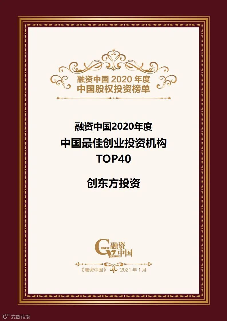 创东方入榜融资中国“2020年度中国最佳创业投资机构Top40”、“2020年度中国最佳创业板投资机构”。