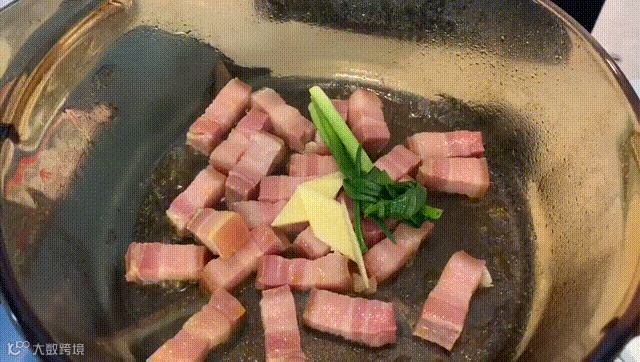 3、锅内放菜籽油,油热后放入咸肉,姜片、葱结,将其煸炒出香味后倒入高汤。