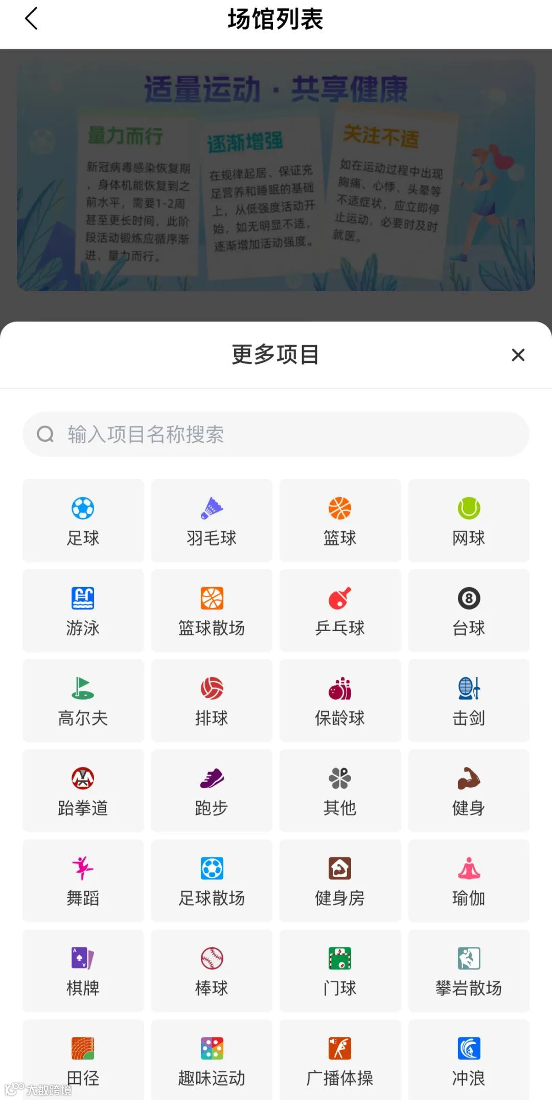 除了按场馆分类选择外,还有各项运动的分类,基本涵盖大众、小众运动,市民可以根据想玩的运动项目选择合适的场馆。