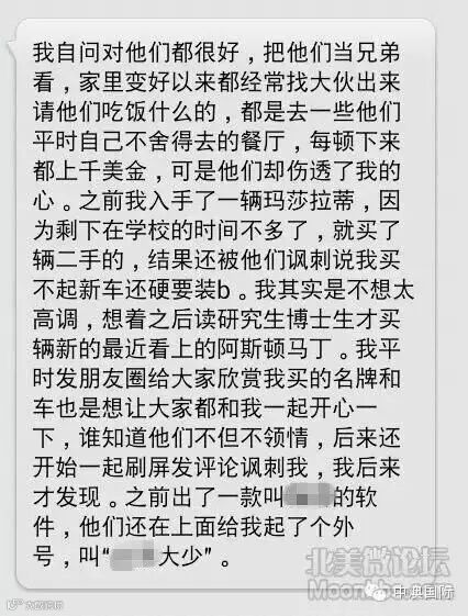 以上种种不过是留学生活中遇到的问题的冰山一角,因爱生恨的举刀向女友,有的虽然没有举起刀,却在背后将前任的种种公布于众;女生之间的闺蜜撕逼,今天我拿你当朋友,明天就要在背后捅你一刀;为了攀比炫富,为了几个LV、Prada,有的女生误入歧途;为了留在美加英澳,抛弃男友女友而转入“有身份”的人的怀抱;无法融入主流社会而内心抑郁,整日沉迷于虚拟的世界……凡此种种,不胜枚举。