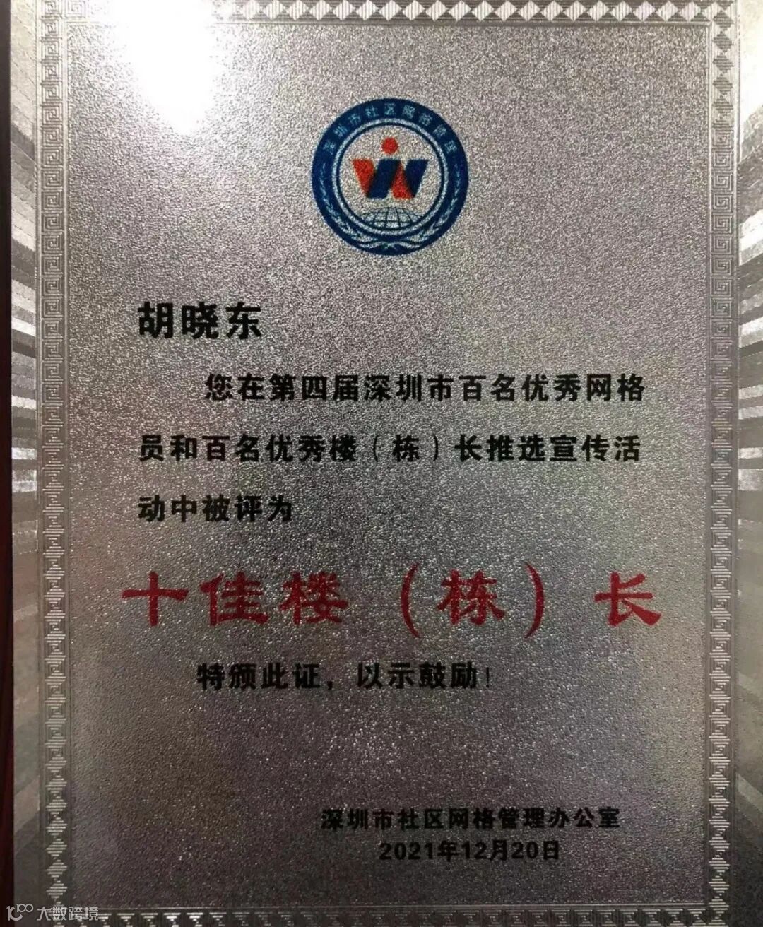 在第四届深圳市百名优秀网格员和百名优秀楼(栋)长推选宣传活动中,深圳分公司大塘龙项目胡晓东荣获“十佳楼(栋)长”称号,并于5月25日领取荣誉奖牌。