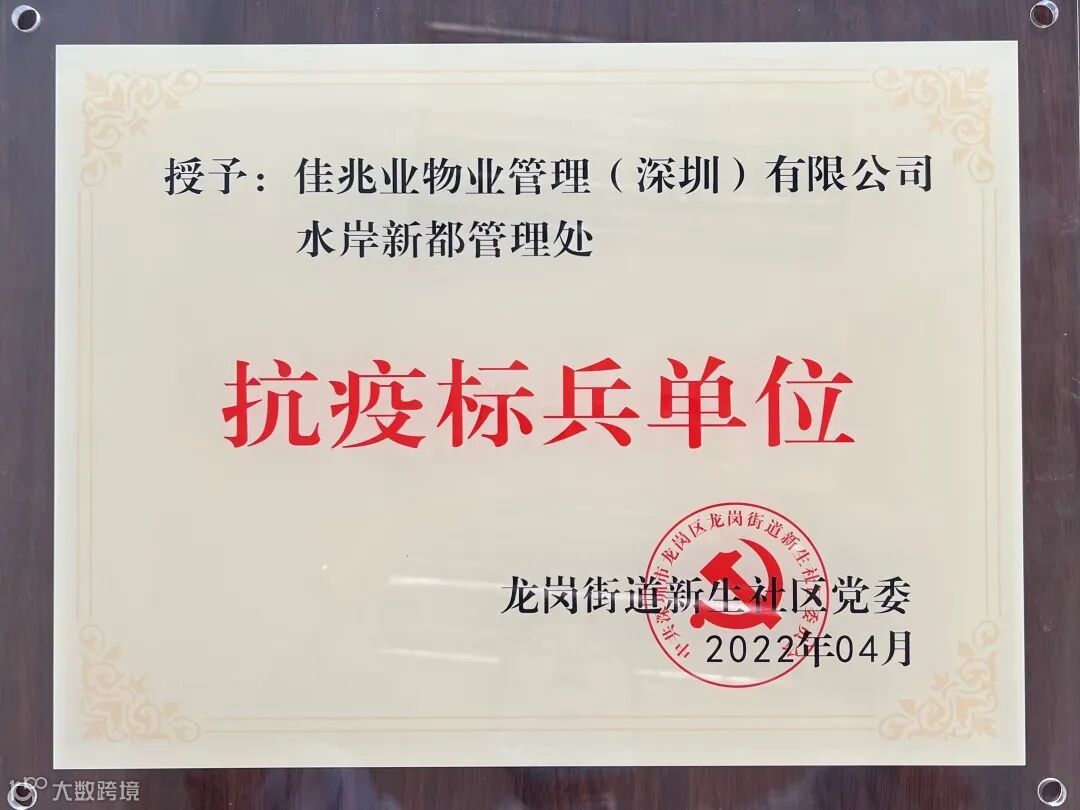 5月5日,深圳分公司水岸新都项目被授予“抗疫标兵单位”荣誉称号,疫情防控工作获龙岗街道新生社区党委充分肯定与赞扬。