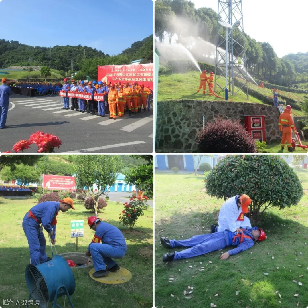 马鞍山江南化工在生产区水油相制备工房外组织开展受限空间作业突发事故及围墙外突发山林火灾事故应急救援、灭火现场演练活动。