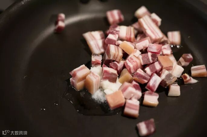 4、放入猪油,然后放入咸肉下去煸香,至金黄色