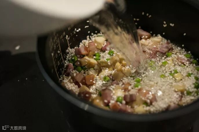 6、把米放入电饭煲加入原材料加入280克水焖至成熟即可