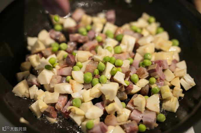 3、把春笋和咸肉切成和豌豆大小的颗粒状