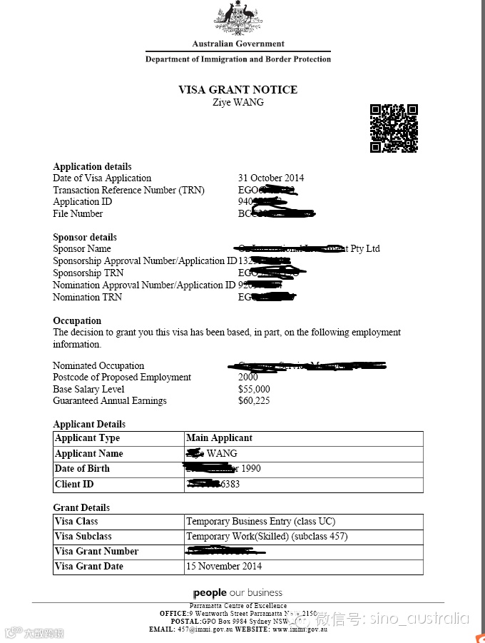 2014年9月我通过朋友介绍认识了中澳国际服务有限公司的伍明秋(Nina)女士。伍女士拥有澳大利亚国立大学移民法硕士学位和专业移民资质,是一位经验极其丰富的移民专家,对各类签证程序都了如指掌。虽然我的专业Applied Finance办理457签证有非常大的难度,但Nina在仔细研究过我的资料后仍然肯定地表示没问题,会为我选择最适合的职位,从而打消了我所有的顾虑。不同于我以前找的中介拖拉的办事态度,Nina为人主动积极,在递交我的457签证申请之后,其余的补充材料,如体检和保险,她也在移民局要求补材料之前都一并递交上去,做事果断高效。更让人意想不到的是,移民局网站上列明457签证正常审理时间为1-3个月,但我的情况却是2014年10月31日递交申请,11月15日即获签,短短两周时间就成功拿到457签证。在此我要衷心感谢中澳国际服务有限公司,感谢Nina的专业和细致服务。这是一家有实力且用心服务的公司,我诚意推荐!