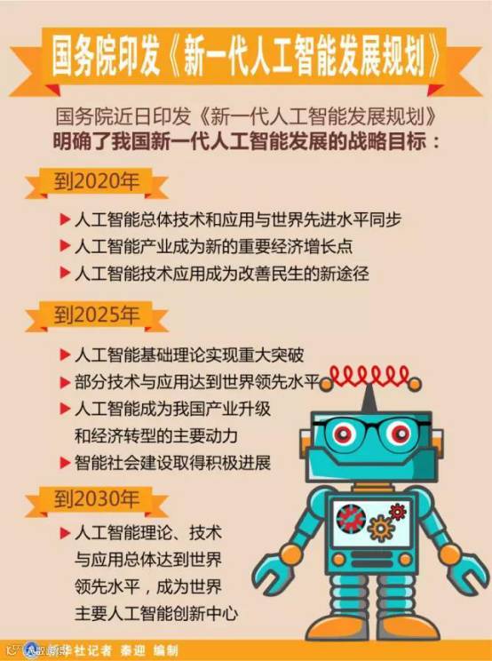 昨天,国务院正式印发新一代人工智能战略规划。规划提出到2020年人工智能技术与世界先进水平同步;到2030年,中国成为世界主要人工智能创新中心,智能经济、智能社会取得明显成效,为跻身创新型国家前列和经济强国奠定重要基础,人工智能核心产业规模超过1万亿元,带动相关产业规模超过10万亿元。