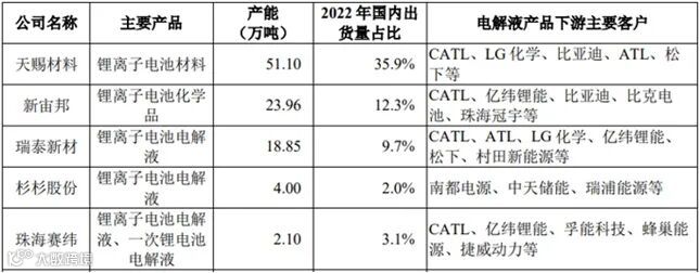 大型龙头企业,又储备了一批迅速发展的新兴中小型企业客户,形成了消费/动力/储能齐头并进、大中小型客户协同发展的客户结构,如消费电池领域代表性企业ATL、力神电池、紫建电子等,动力和储能电池领域的代表性企业CATL、亿纬锂能、孚能科技、瑞浦能源、赣锋锂电,两轮车动力电池领域代表企业天能电池、超威集团等,均是与公司持续合作的客户。同时,公司还成功进入SK、LG的供应链,成为该等企业的电解液生产商。