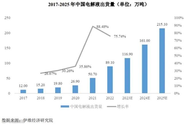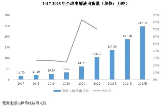 根据研究机构伊维经济研究院发布的《中国锂离子电池电解液行业发展白皮书(2023年)》,在锂电池出货量的带动下,预计2025年全球电解液出货量将增长至247.30万吨;中国电解液总体出货量可达到215.10万吨。
