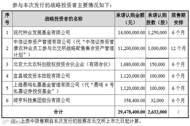 公告显示,6家战投中,现代种业发展基金有限公司拟认购数量最多,为125万股,中信证券资产管理有限公司(代“中信证券资管康农种业员工参与北交所战略配售集合资产管理计划”)、