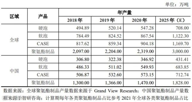 2020年全球聚氨酯制品产量约2,319万吨,其中中国聚氨酯制品产量约1,470万吨。根据预测,到2025年,全球及中国聚氨酯制品产量如下: