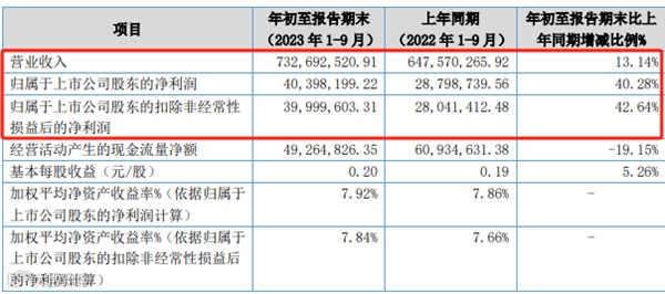 相比于上半年业绩实现的快速增长,三季度公司的发展丝毫没有停下脚步。公司三季报显示,前三季度,公司实现营业收入7.33亿元,同比增长13.14%,表明欧福蛋业在市场份额和业务拓展方面取得了积极的成果。同时,归属于上市公司股东的净利润达到4039.8万元,同比增长40.28%,这表明公司在成本控制、产品定价和财务管理方面也表现出色。