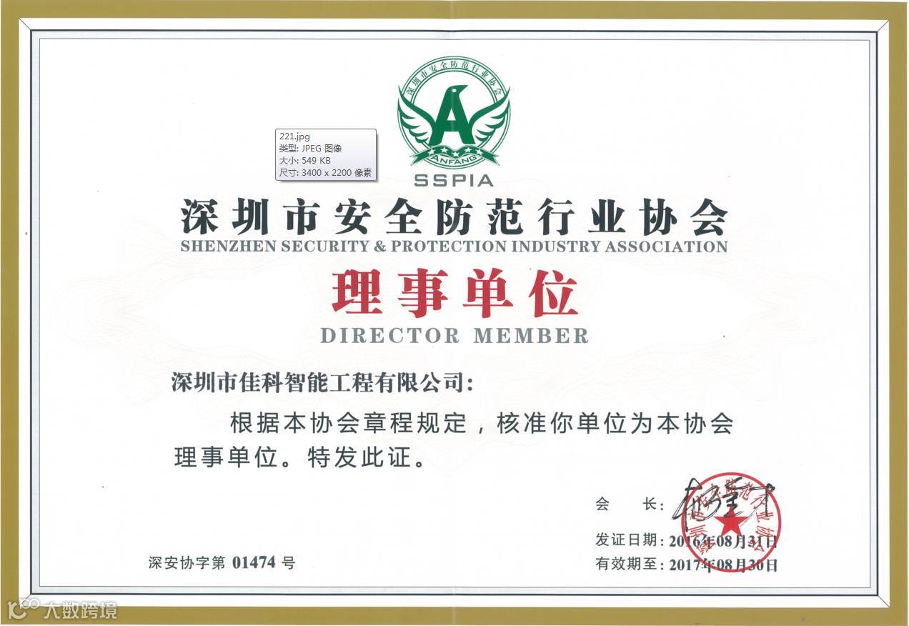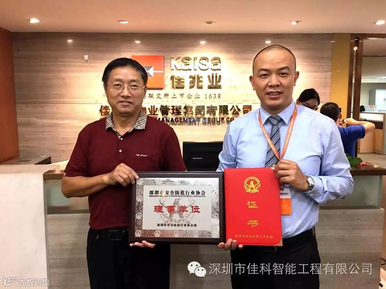 2016年9月12日下午14:30分,深圳市安全防范行业协会联盟副秘书长黄云萍先生为深圳市佳科智能工程有限公司颁发了深圳市安全防范行业协会理事单位的牌匾和证书。沈智聪先生作为深圳市佳科智能工程有限公司负责人接受这一殊荣。此举意味着深圳市佳科智能工程有限公司正式成为深圳市安全防范行业协会的重要一员,也意味着深圳市佳科智能工程有限公司在安全防范行业中体现出高级别的行业标准,也因此得到了同行广泛的认知及认可。