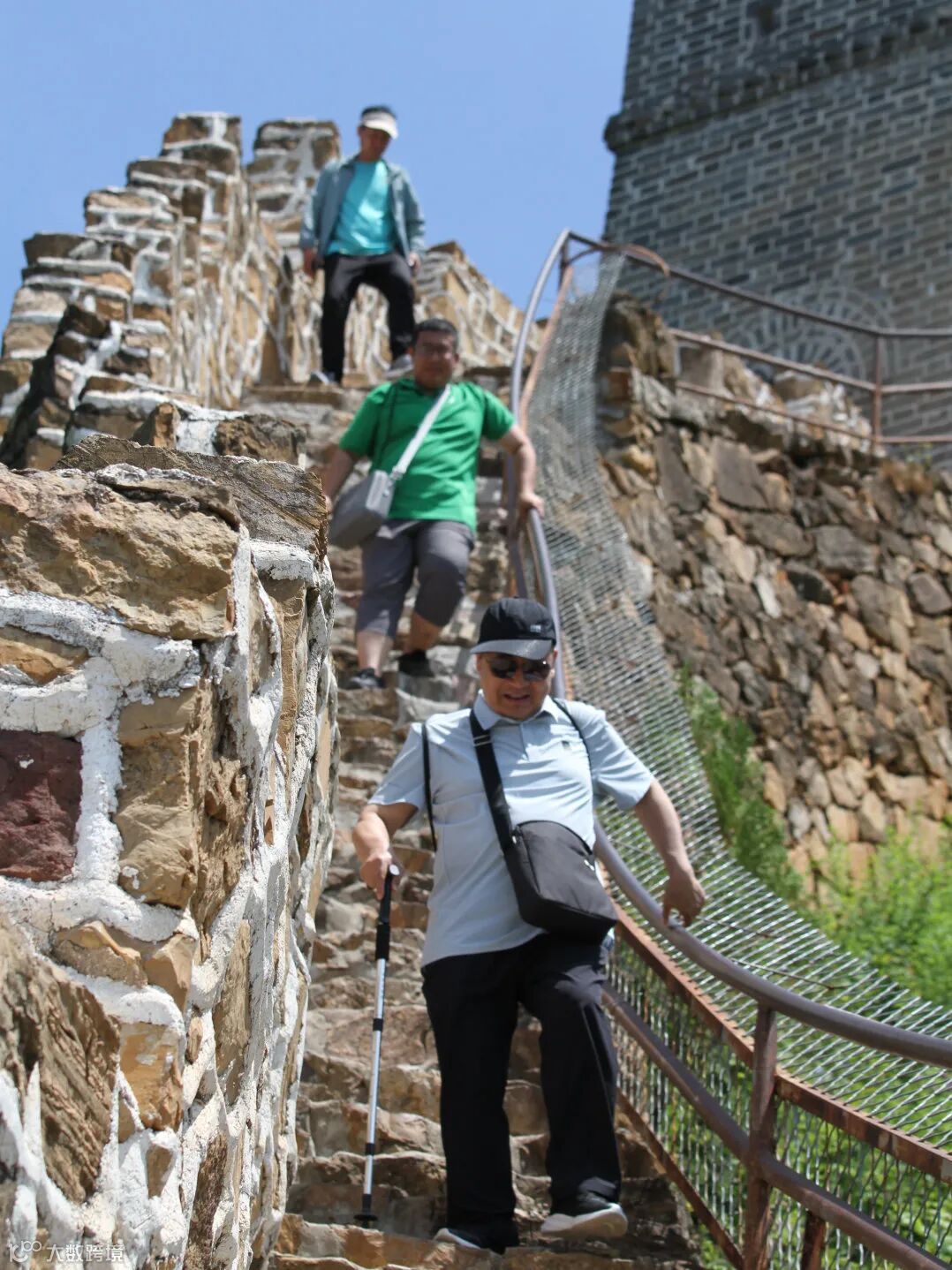 员工们相互协作,将沿途的垃圾捡起,装入环保袋中,收集整理打包,团队配合着搬运下山,分工明确,共同为守护长城的青山绿水贡献自己的力量。