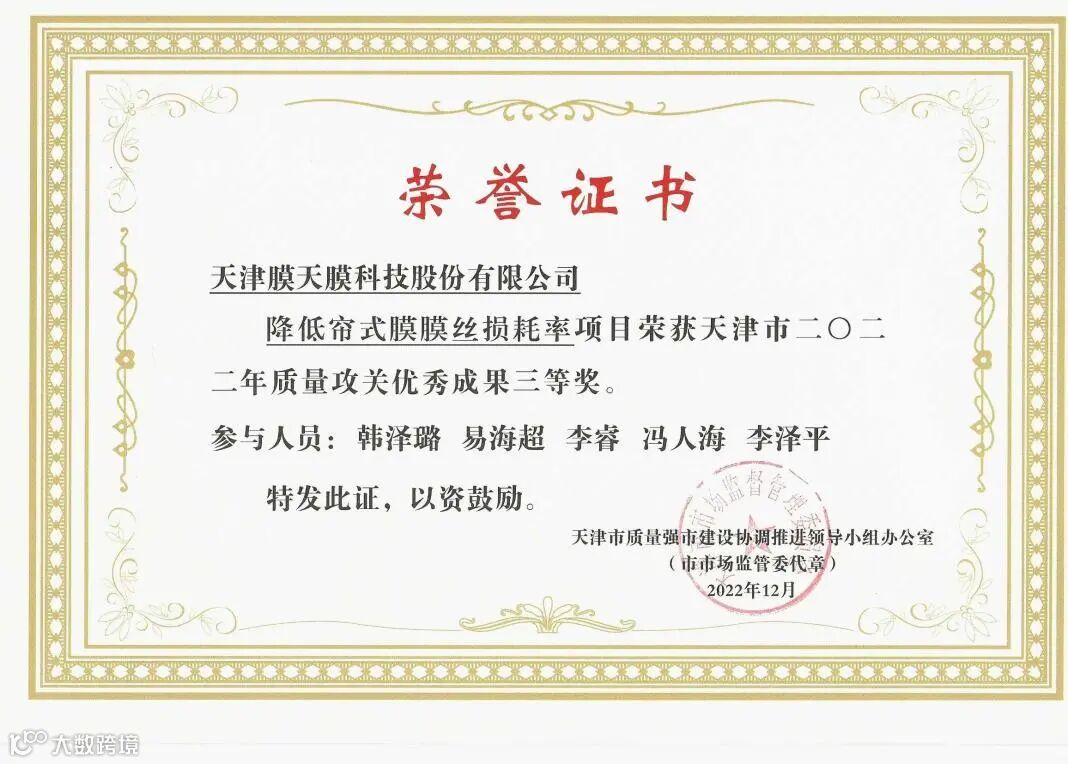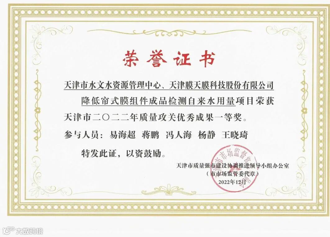 近期,天津市质量工作领导小组办公室公布,天津膜天膜科技股份有限公司联合天津市水文水资源管理中心共同完成的“降低帘式膜组件成品检测自来水用量”项目获得2022年度天津市质量攻关项目一等奖。