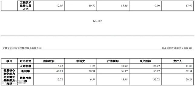 由于工程咨询服务行业知识体系涉及面广,专业技术性强,具有轻资产、重人才、高附加值的特征,专业技术人才是企业发展的核心资产和关键资源要素。类似于软件服务业,因此专业人才的经济效益单位创值是衡量此类企业的关键指标,我们可以看到安天利信在和同行公司对比中关键指标如人均利润、毛利率仅次于国义招标,工程技术注册人员占比则大幅领先于同行。