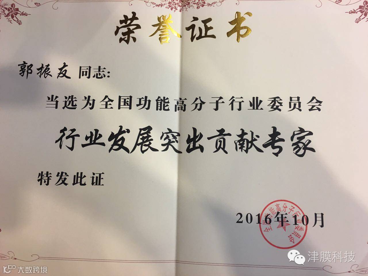 2016年10月举行的“全国功能高分子行业委员会成立二十周年庆典大会暨技术研讨会”上,津膜科技特种分离部经理郭振友当选为“行业发展突出贡献专家”。获此殊荣是对他本人及研发团队将膜技术创新工艺应用于丙烯酰胺行业,促进行业健康发展做出卓越贡献的高度肯定,也是对津膜科技在功能高分子领域地位的充分认可。