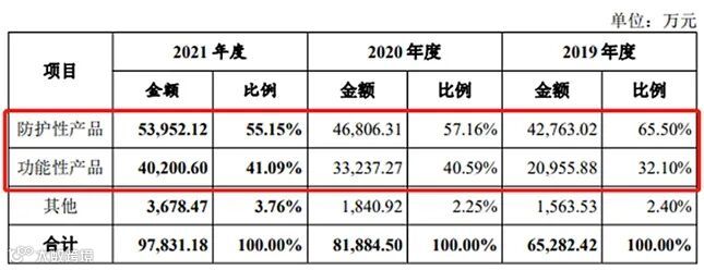 在整年度主营业务收入分产品构成中,保护性产品与功能性产品作为公司核心业务贡献收入,并在2019-2021年间贡献收入值在持续不断增长。此外,公司主要产品中的防护性产品主要用于消费电子产品的安全及形态防护,在生产及储运过程中起到缓冲、减震、抗压、防尘、防潮等防护作用;功能性产品是消费电子产品及其组件实现特定功能所需的元器件,在消费电子产品狭小内部空间实现粘接、固定、防震、密封、电磁屏蔽、导电、绝缘等功能或在消费电子产品表面实现防刮、防尘、防水、标识等功能,下游市场应用广泛。