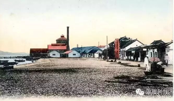 刘公岛海水淡化设备运行期间的照片,可以见到蒸馏用的锅炉烟囱和取海水的管道