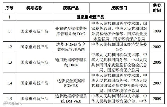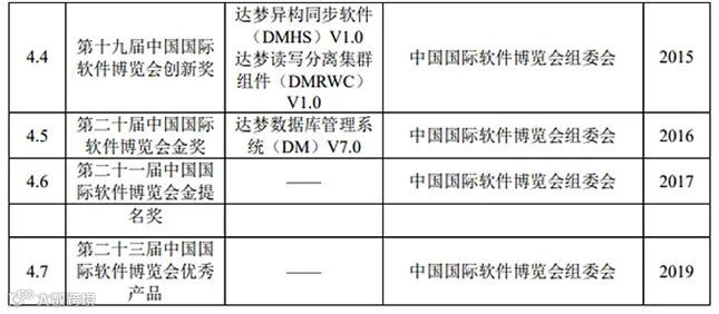 公司核心技术及核心产品相关的重要奖项,图片来源:达梦数据招股书