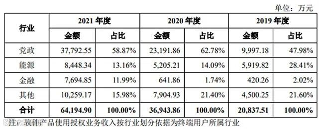 报告期内,公司软件产品使用授权业务终端用户主要集中于党政、能源和金融等领域。2019年度、2020年度、2021年度,公司在该等领域实现的软件产品使用授权业务收入金额占比分别为78.41%、78.61%和84.02%。