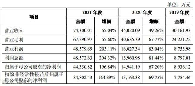 报告期内,公司营业收入分别为30,161.93万元、45,020.09万元和74,300.01万元,2019至2021年度营业收入的年均复合增长率为56.95%;扣除非经常性损益后归属于母公司股东的净利润分别为7,754.46万元、13,163.38万元和34,802.43万元,报告期内扣除非经常性损益后归属于母公司股东的净利润年均复合增长率为111.85%。