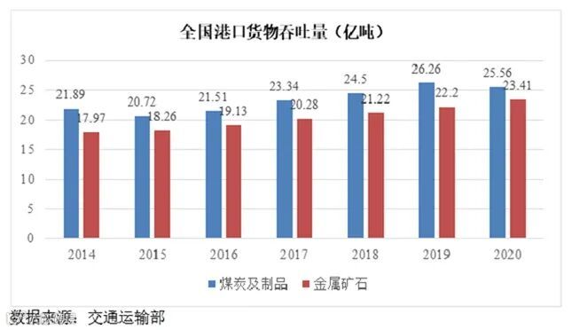 近年来,我国干散货运输行业繁荣发展,煤炭、铁矿石作为主要干散货品种,其市场需求是干散货市场发展的重要推动力。根据交通运输部统计,2014~2019 年我国煤炭及制品、金属矿石等货物吞吐量均呈现小幅增长趋势,2020 年因受印尼相关政策影响,煤炭及制品吞吐量有所下降,但铁矿石仍然保持增长。