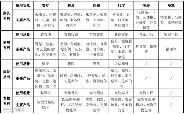 目前致欧科技产品主要包括家具系列、家居系列、庭院系列、宠物系列以及其他产品,从使用场景角度划分,公司产品涵盖了客厅、卧室、厨房、门厅、庭院、户外等不同场景,已逐渐形成不同风格或材质互相组合设计的小件家居用品、大件室内家具和庭院户外家具等多系列产品矩阵,从而满足客户在多场景下的消费需求,实现消费者一站式采购。