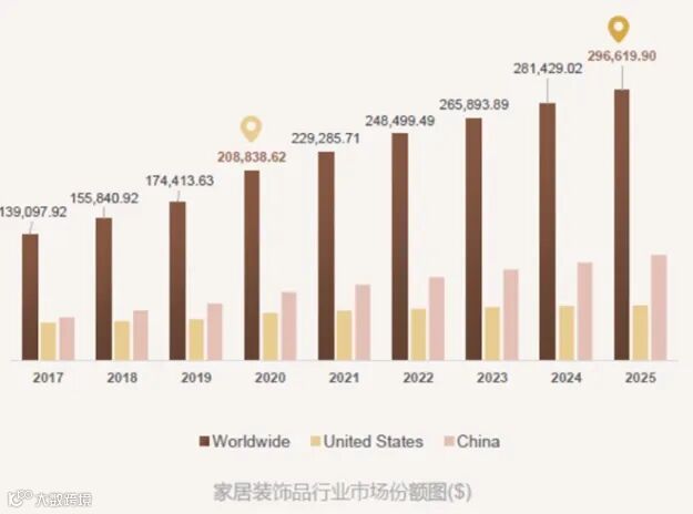 时代引领潮流,科技改变生活,随着近年来我国经济的不断发展,家具用品朝着智能化、绿色环保化方向升级的趋势下,家居行业已成为地产后周期最具潜力的赛道,相关数据显示,预计2025年家居装饰品行业市场全球体量接近3000亿美金。